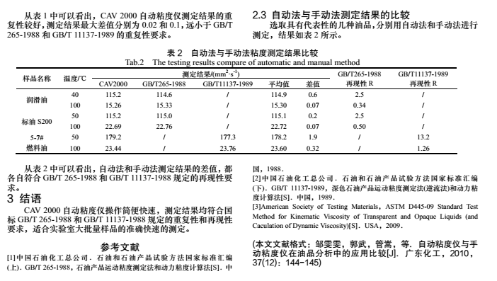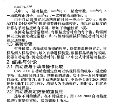 [2](深色石油產品運動粘度測定法(逆流法) 和動力粘度計算法),均采用手動法進行測定,取樣及清洗工 作復雜,測定時間較長,不適合大批量樣品的準確快速的測定。 而美G CANNON 公司生產的 CAV 2000 自動粘度儀操作簡便、 快速,測定結果精度高,用于實驗室檢測能極大提高檢測效率 和檢測的準確度。                   1 實驗部分                   1.1 儀器                                       CAV 2000 自動粘度儀是一種具有寬粘度測量范圍的粘度 測量儀器,粘度范圍為:0.5~5000 cst/40 ℃,0.5~2000 cst/100 ℃,適用于透明及不透明液體運動粘度的測定,包括原油、輕 重質燃料油、潤滑油、柴油、添加劑、廢油等,能夠自行選擇 毛細管的測量范圍,恒溫浴溫度范圍為:20~150 ℃,并配有 雙溶劑清洗系統和烘干功能,能夠一次進樣 26 個樣品進行連 續測定。                         1.2 工作原理                   在 CAV 2000 自動粘度測定中,運動粘度的計算基于以下 公式: