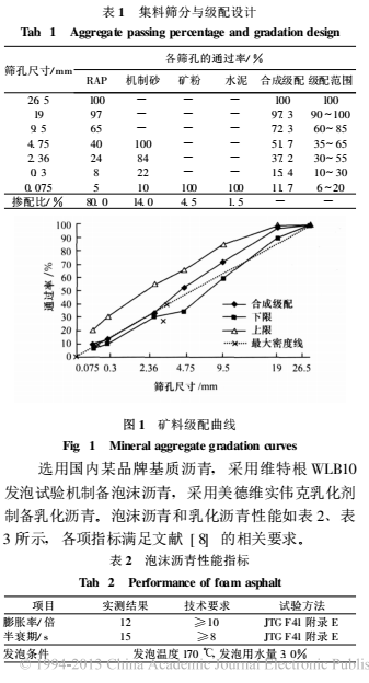32.5 P.S.A 礦渣硅酸鹽水泥 。級(jí)配篩分 (水篩法)和混合料摻配試驗(yàn)結(jié)果如表 1 和圖 1 所示 , 合成級(jí)配范圍滿(mǎn)足文獻(xiàn) [ 8] 對(duì)泡沫瀝青冷再生混合料中粒式級(jí)配范圍的要求。
