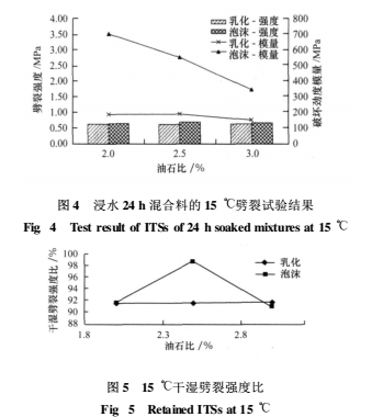 (1)在油石比、 級(jí)配完全相同的情況下, 泡沫瀝青冷再生混合料浸水 24 h 后的 15 ℃劈裂強(qiáng)度略高于乳化瀝青冷再生混合料, 與未浸水的 15 ℃劈裂試驗(yàn)結(jié)果是一致的。