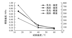 采用 2.0 %的油石比制備試樣 , 分別在 15 、 40 、 60 ℃條件下進(jìn)行劈裂試驗(yàn), 試驗(yàn)結(jié)果如圖 6 所示。從圖 6 中可以看出, 40 ℃和 60 ℃條件下, 泡沫瀝青冷再生混合料劈裂強(qiáng)度分別為 0.18 、 0.09 MPa , 僅為