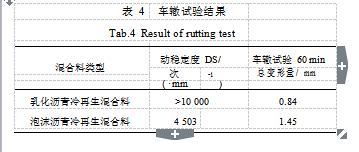 2.5 %的油石比, 分別制備乳化瀝青冷再生混合料和泡沫瀝青冷再生混合料試件, 進(jìn)行車(chē)轍試驗(yàn) , 試驗(yàn)結(jié)果如表4 所示。